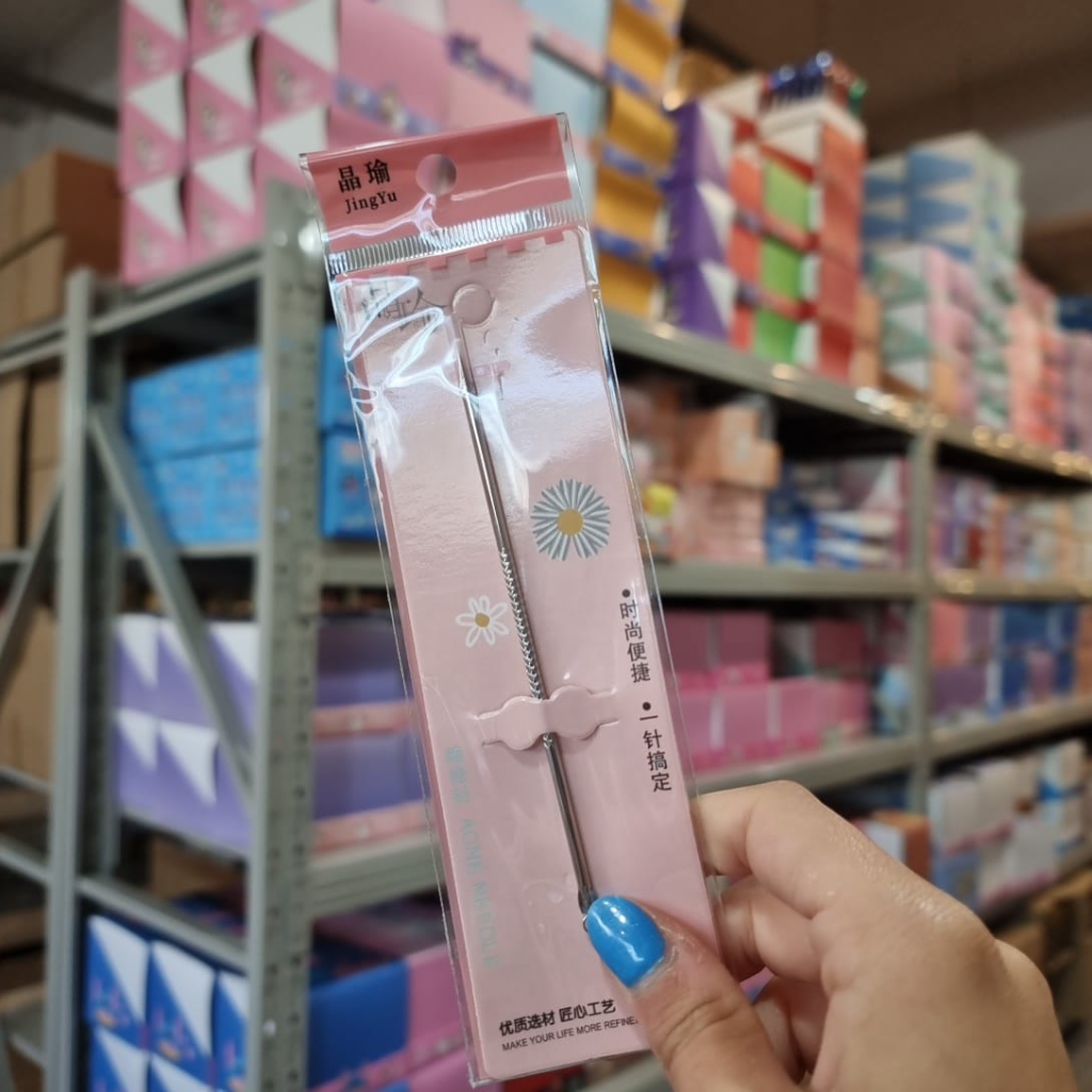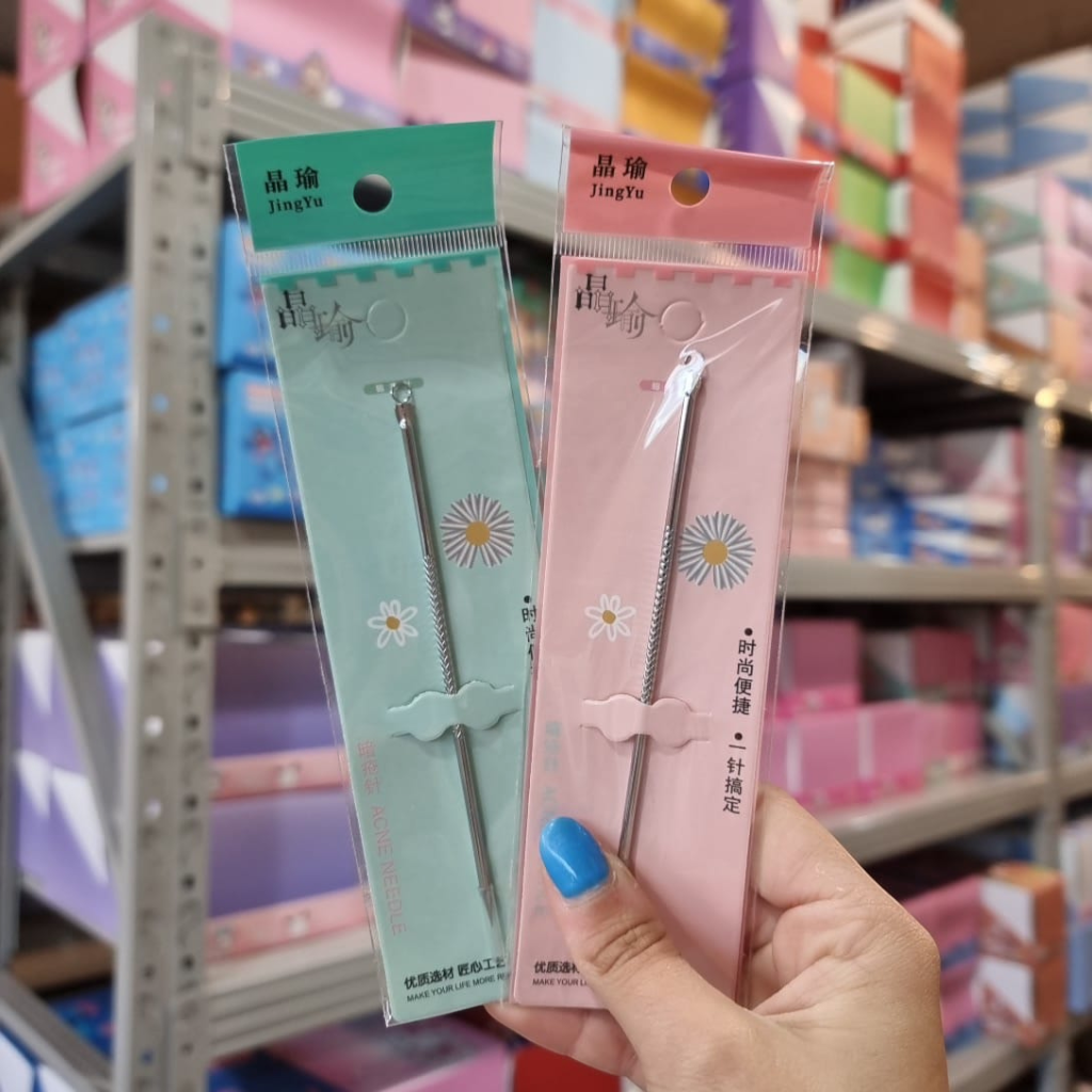 Aguja profesional para extraccion de puntos negros y granitos. Fabricada en acero inoxidable con doble punta: una aguja fina para abrir suavemente los poros y un aro para presionar y eliminar las impurezas. Su diseño compacto y facil de limpiar permite un uso preciso e higienico en el cuidado facial diario.