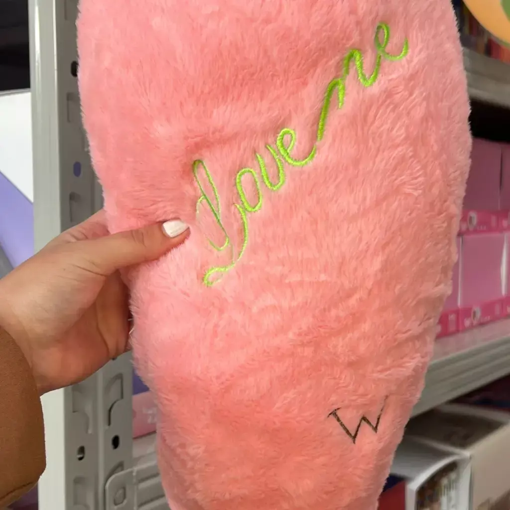 Almohadon de peluche suave con forma de zanahoria color rosa y hojas verdes. Incluye detalle bordado con la frase Love me en hilo verde. Ideal para decorar, regalar o usar como almohada abrazable gracias a su textura mullida y diseño kawaii.