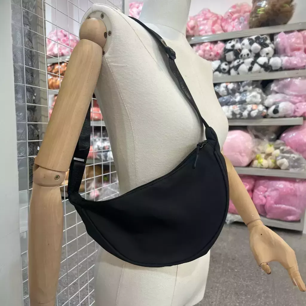 Cartera tipo bandolera con diseño media luna en color negro liso. Fabricada en material liviano y flexible, cuenta con correa regulable y cierre superior con cremallera. Ideal para uso diario, salidas o complementar outfits minimalistas. Práctica, liviana y con buen espacio interior. Se adapta al cuerpo de forma cómoda y segura.