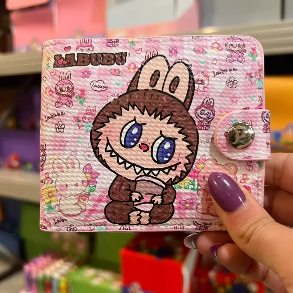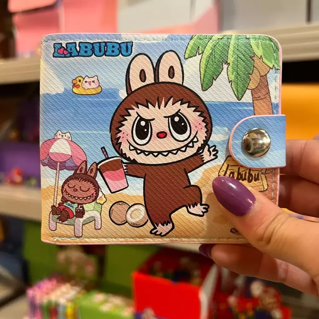 Billetera kawaii compacta con diseño de personajes como Labubu y Capibara. Cuenta con compartimentos para tarjetas, billetes y ventana para documentos. Exterior colorido con ilustraciones divertidas y cierre con broche a presion. Practica, ligera y perfecta para llevar en cartera o mochila.