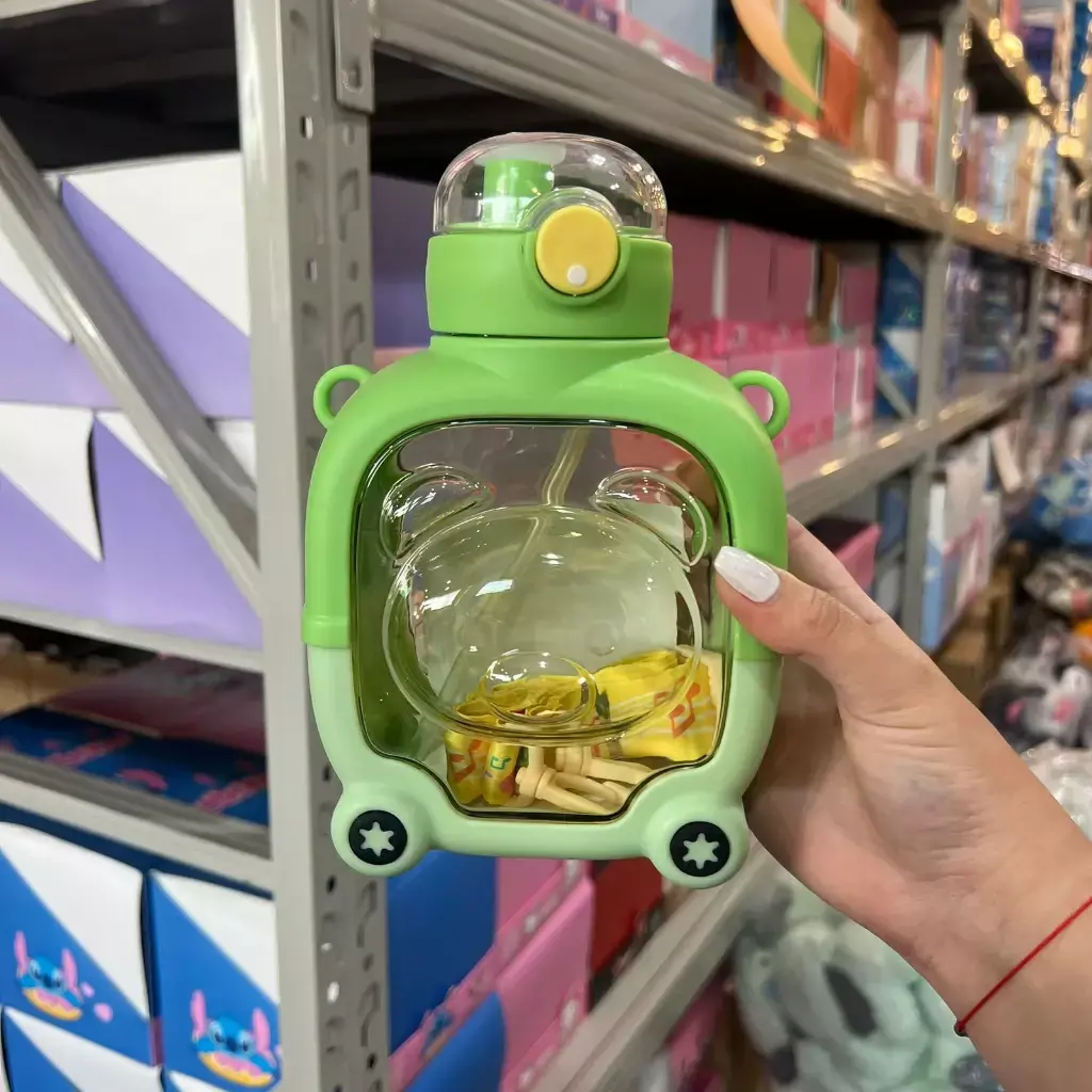 Botella infantil con diseño cantimplora en forma de oso, ideal para llevar a la escuela o paseos. Tiene correa regulable para colgar, tapa con botón a presión y boquilla para tomar fácilmente. Su diseño transparente permite ver el contenido y viene en colores divertidos como rosa, celeste y verde.