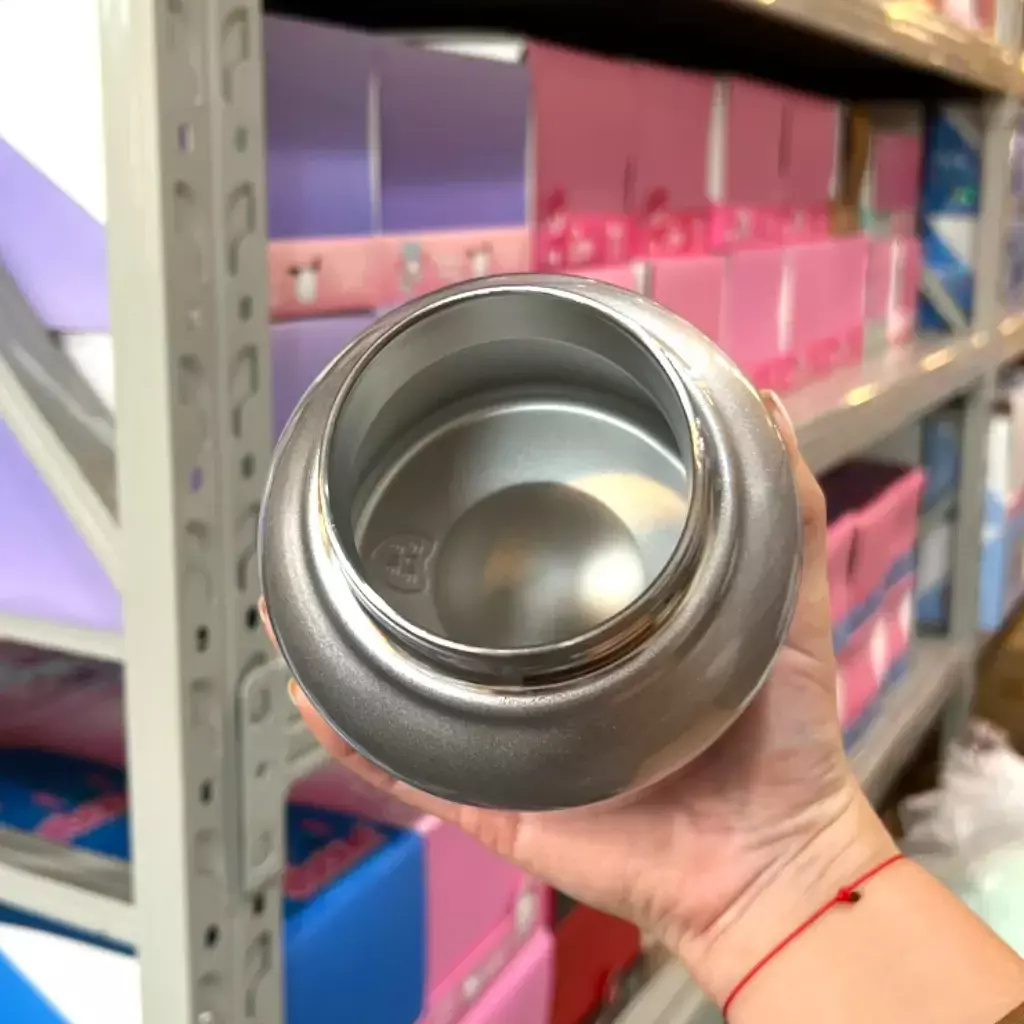 Botella termica de acero inoxidable con diseño original en forma de tetera mini. Incluye manija grande para transportar facilmente, tapa a rosca y accesorios como sorbete y piezas adicionales. Con frase decorativa "FUN SUPPLY CHAIN" en el frente. Disponible en colores plateado con rosa o negro con rojo. Ideal para uso diario, regalar o llevar bebidas frias y calientes con estilo kawaii.
