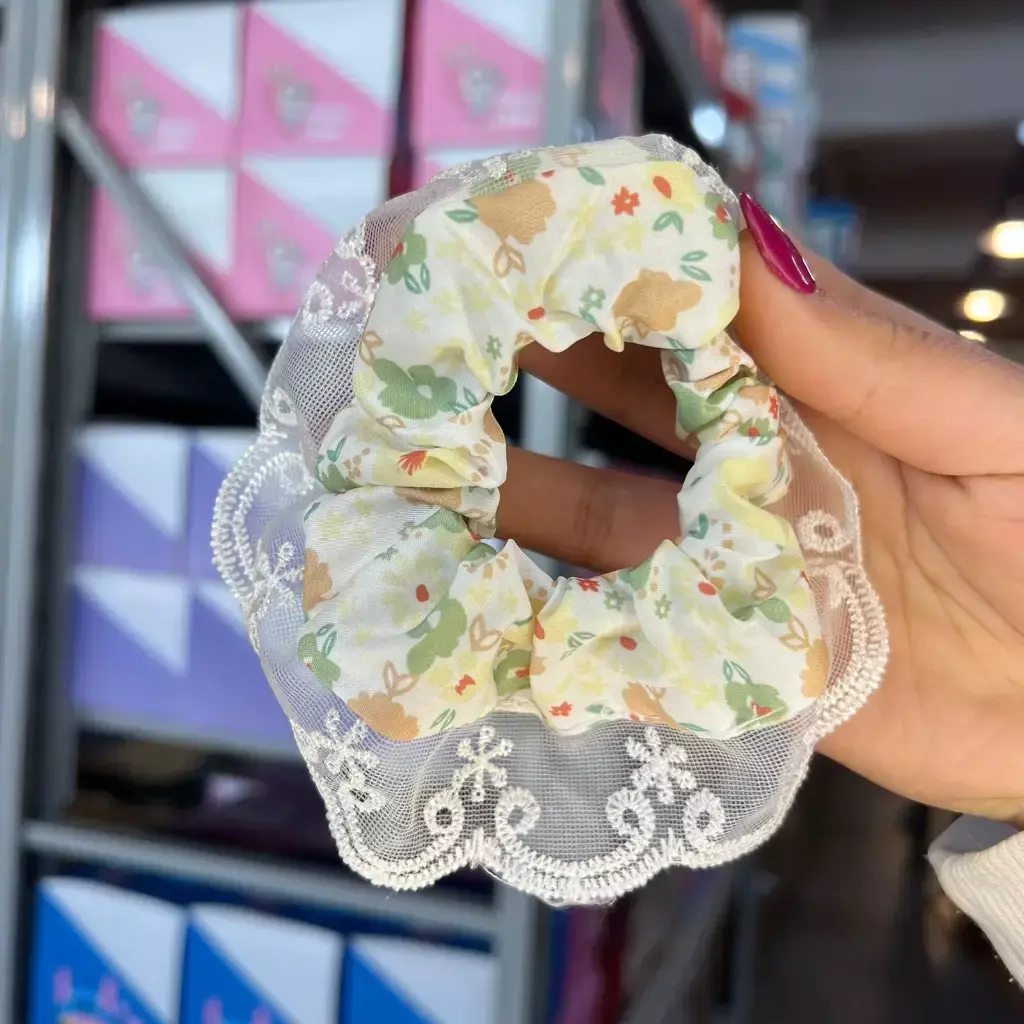 Colita elástica forrada en tela estampada con flores en tonos suaves, rodeada por delicado encaje blanco que aporta un estilo romántico y femenino. Ideal para peinados tiernos y originales, ya sea para uso diario, escolares o para complementar looks especiales. Cómoda y resistente, su diseño combina practicidad con un toque elegante y coqueto.