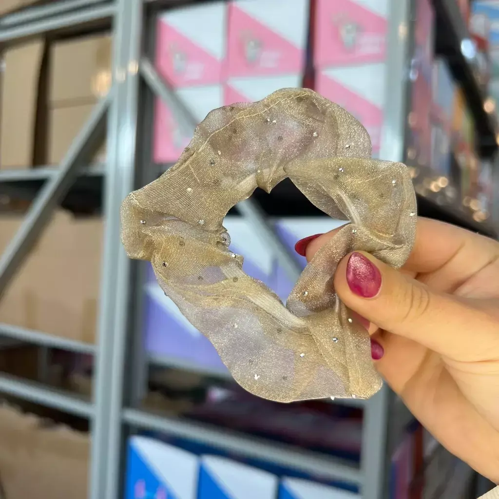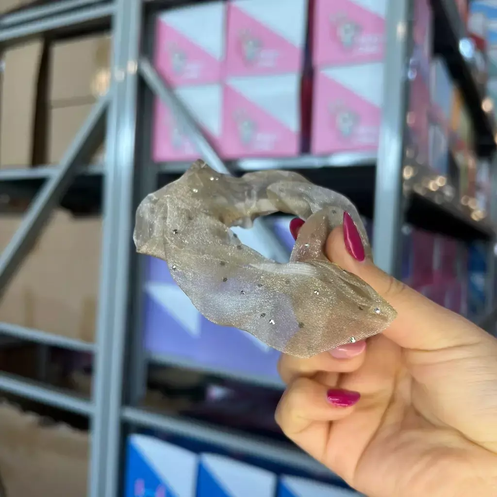 Colita de tela de tul en color negro, decorada con pequeños puntos brillantes que le dan un toque elegante y delicado. Su diseño combina sencillez con estilo, ideal tanto para peinados de uso diario como para ocasiones especiales. El elástico es firme y cómodo, asegurando un buen agarre sin dañar el cabello.