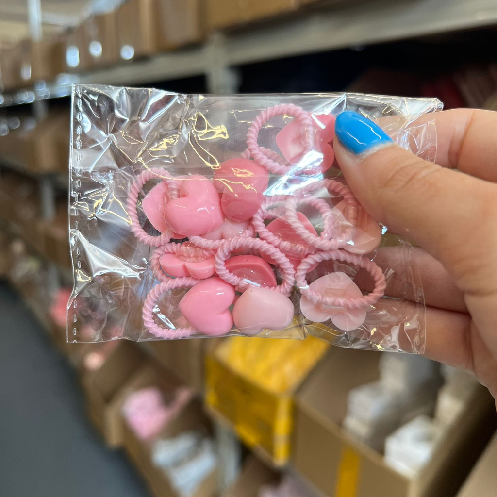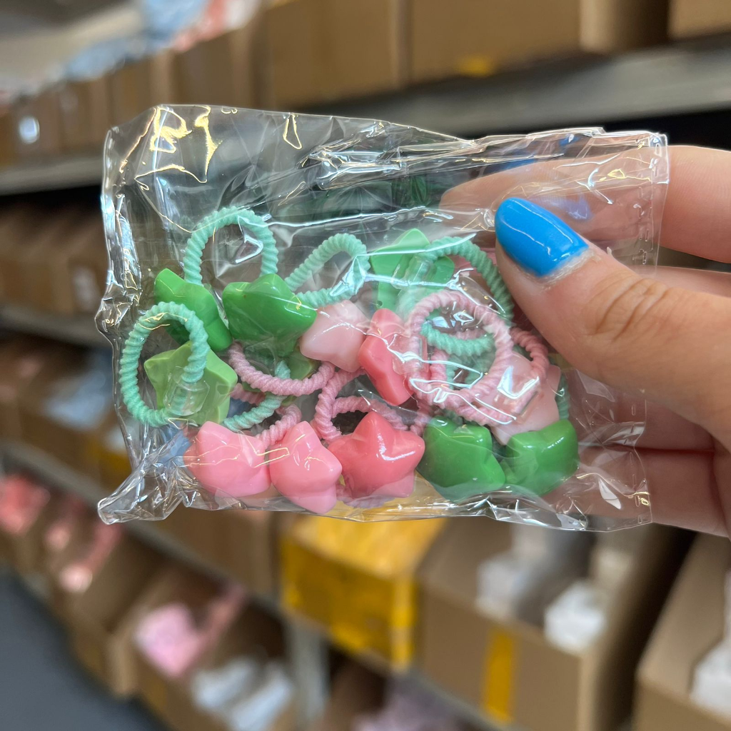 Colitas para el pelo con elástico cubierto de hilo y dijes plásticos en forma de corazones y estrellas. Vienen en colores surtidos como rosa, lila, celeste, verde y azul, combinando diseño divertido con practicidad. Ideales para peinados diarios, regalar o incluir en souvenirs de cumpleaños.