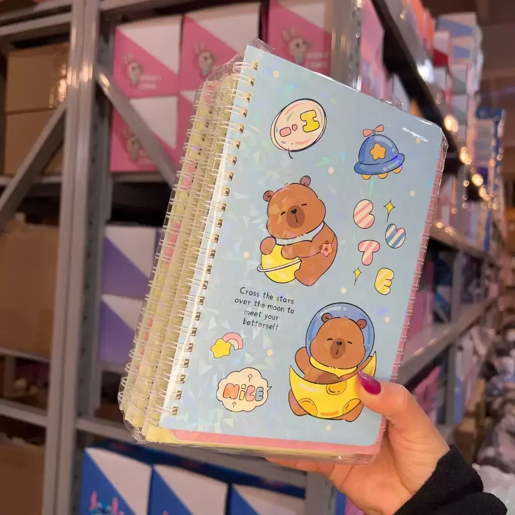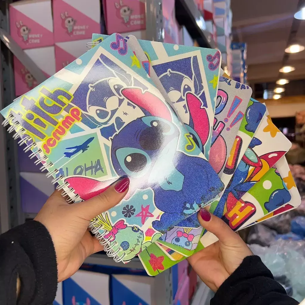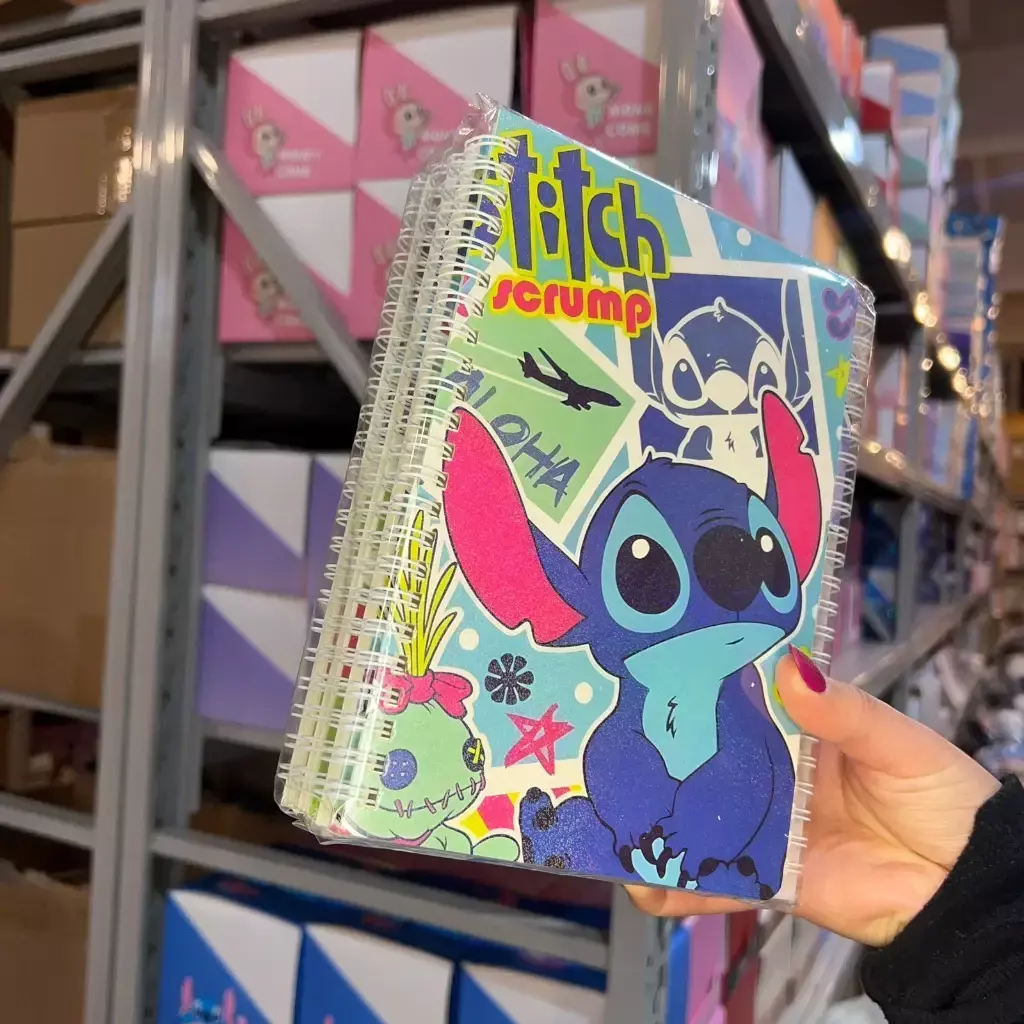 Cuaderno anillado con tapa dura ilustrada de Stitch, ideal para tomar notas, hacer apuntes o usar como diario personal. Su diseño colorido y kawaii lo convierte en un accesorio divertido y coleccionable para fans de Disney. Incluye hojas rayadas y resistentes, con tamaño práctico para llevar en la mochila o cartera. Disponible en diferentes modelos con portadas brillantes y coloridas.