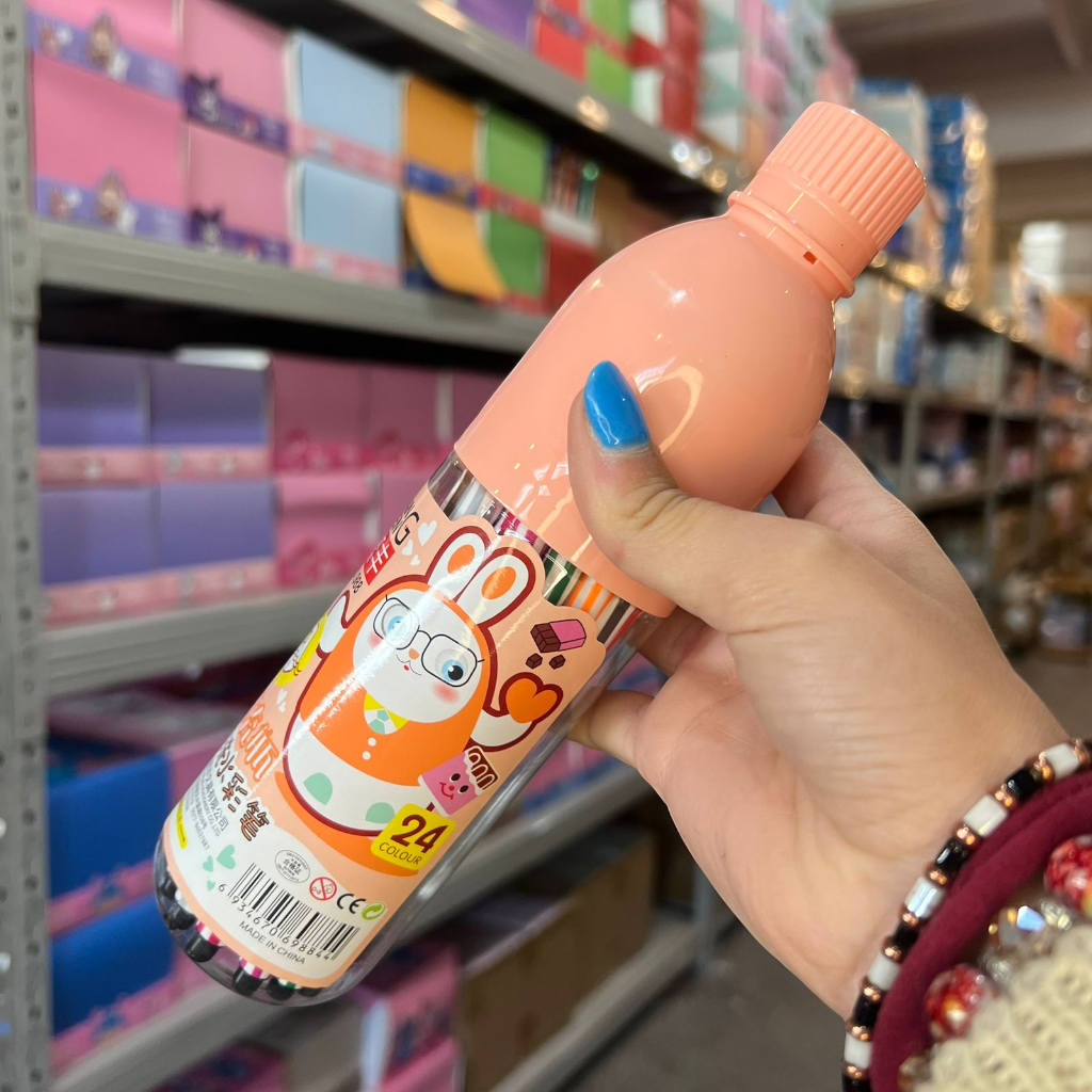 Set de fibrones de 24 colores vivos presentados en un práctico estuche rígido con forma de botella. El diseño divertido con ilustraciones infantiles los hace ideales para chicos, mientras que el envase permite mantenerlos organizados y transportarlos fácilmente. Perfectos para dibujar, colorear y usar en el colegio o en casa. Tapa a rosca para mayor seguridad.