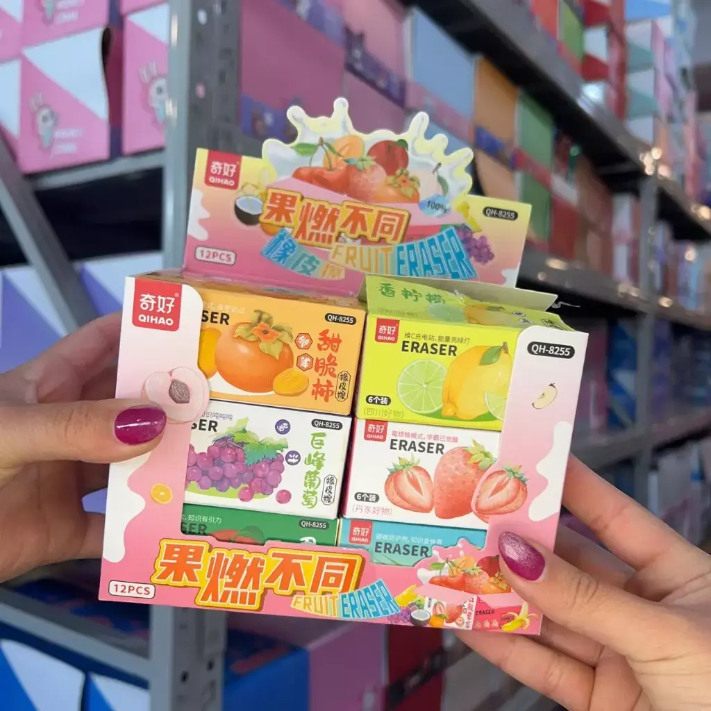 Gomas de borrar con diseño inspirado en distintas frutas. Cada caja trae mini gomas con ilustraciones de limón, frutilla, uva, caqui y más. Ideal para uso escolar, colección o regalo original. Colores vivos y diseños divertidos que hacen más entretenidos los apuntes.