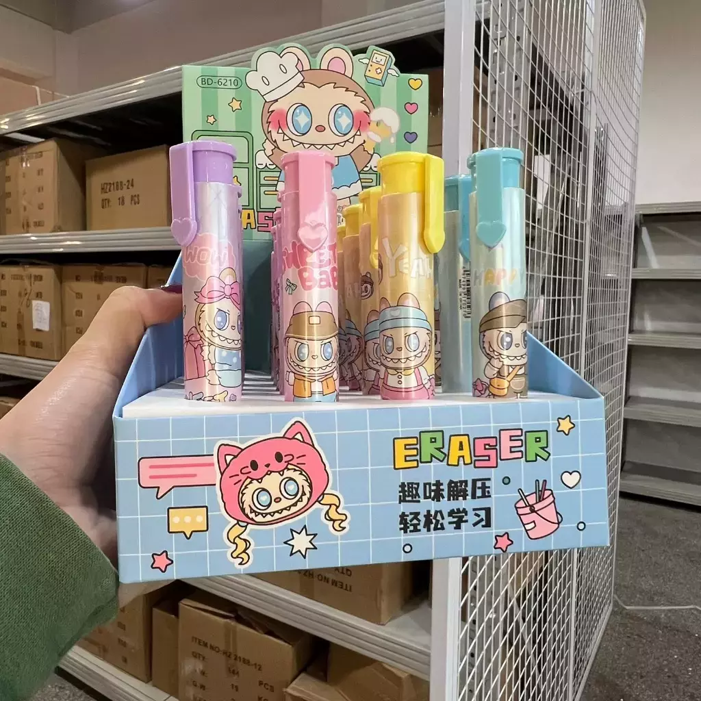 Gomas de borrar en formato lapicera con sistema retractil, practicas y comodas para usar sin ensuciarse las manos. Cada modelo trae un diseño kawaii en colores pastel con personajes divertidos. Perfectas para la cartuchera y para coleccionar.