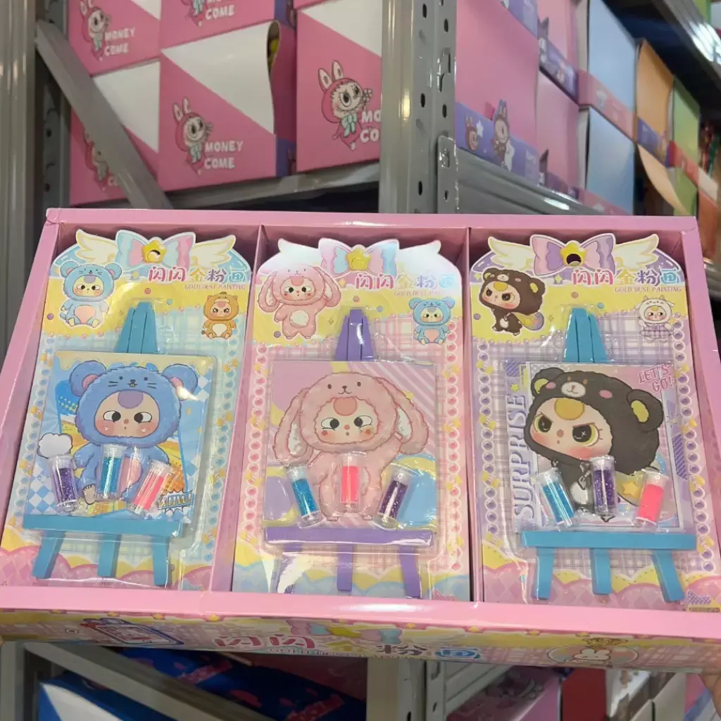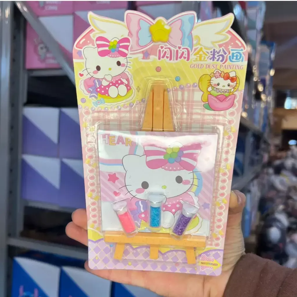 Set creativo infantil con personajes de Sanrio, incluye mini caballete, lámina ilustrada y frasquitos de brillantina de colores para decorar. Ideal para actividades artísticas, manualidades y regalos. Modelos variados: My Melody, Hello Kitty, Cinnamoroll y Kuromi.