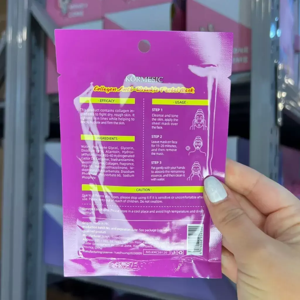 Mascarillas faciales Kormesic en diferentes formulas para el cuidado de la piel: Rose con vitamina C y E para hidratar e iluminar, Firming con oligopéptidos para reafirmar, Barrier Repair con ceramidas para reparar y proteger, y Anti-Wrinkle con colágeno para suavizar arrugas y aportar firmeza. Cada variante ofrece hidratacion profunda y un acabado radiante. Contenido: 25 ml.