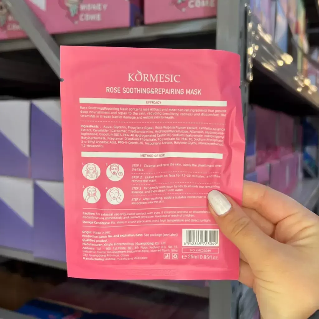 La mascarilla facial de rosa Kormesic está elaborada con 89% de extractos naturales como rosa rugosa, centella asiática y ceramida. Su fórmula calma la piel sensible, reduce la rojez y aporta hidratación profunda, ayudando a reparar la barrera cutánea. Deja la piel suave, luminosa y revitalizada con cada aplicación. Ideal para un cuidado relajante y nutritivo.