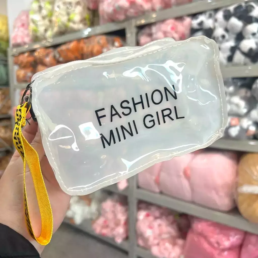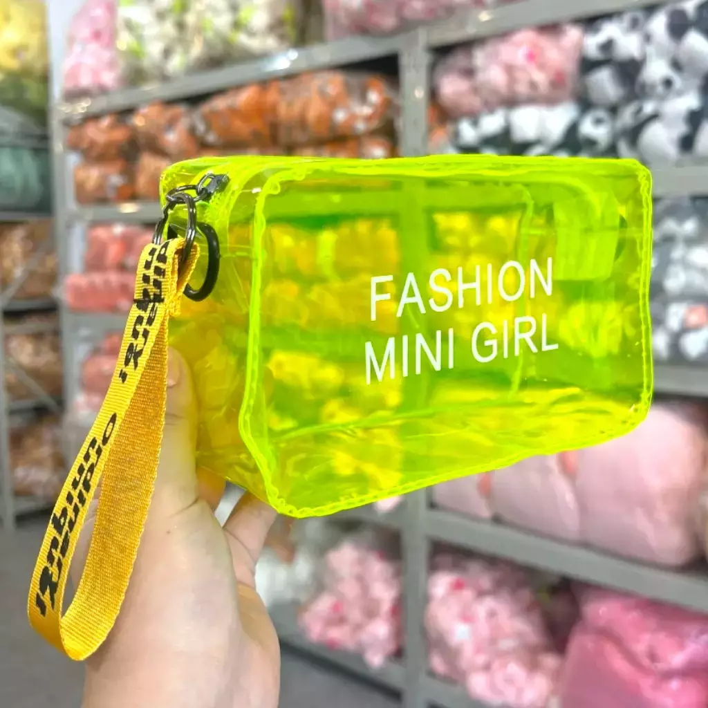 Neceser o mini bolso de PVC transparente con diseño moderno y colores vibrantes. Incluye cierre seguro, frase estampada "Fashion Mini Girl" y manija de cinta con enganche desmontable. Ideal para llevar útiles, maquillaje o accesorios. Disponible en varios colores neón y pastel.