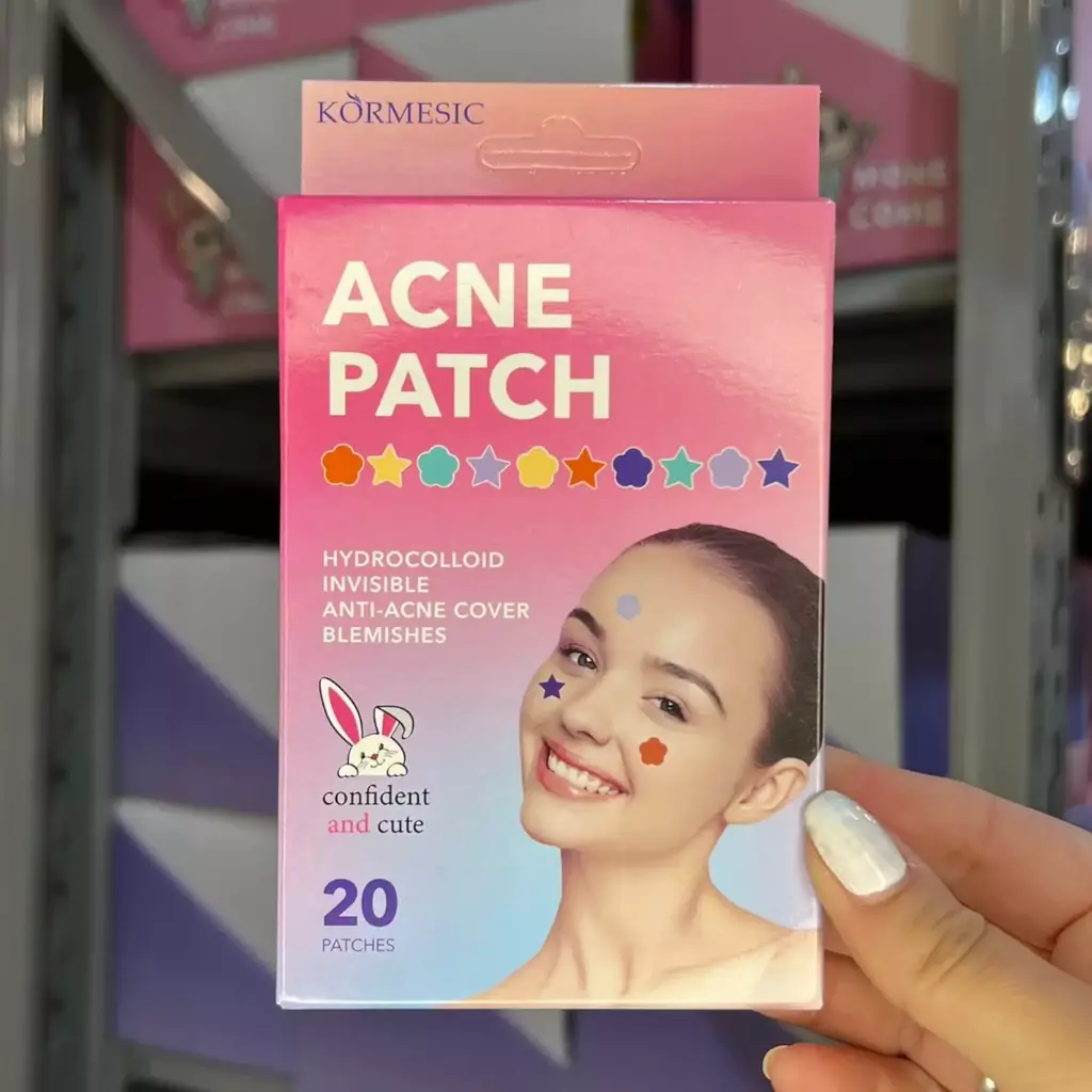 Parches hidrocoloides para acne Kormesic con diseño en forma de estrellas y flores de colores. Ayudan a reducir la inflamacion, cubrir granitos y proteger la piel. Caja con 20 unidades faciles de aplicar y llevar en tu rutina diaria.