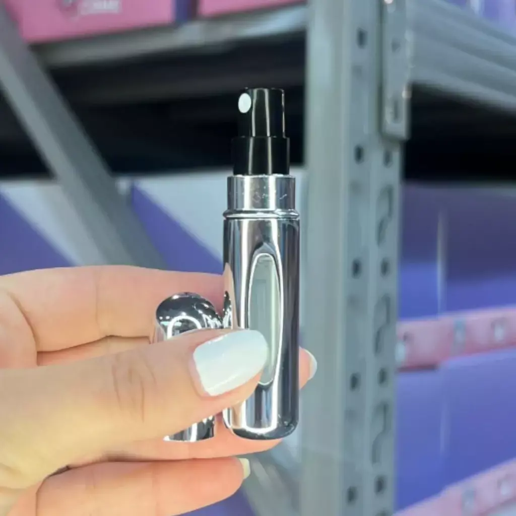 Atomizador portátil recargable fabricado en aluminio resistente, ideal para llevar tu fragancia favorita en la cartera, bolso o de viaje. Tiene ventana lateral para ver la cantidad de perfume disponible y sistema de recarga desde la válvula inferior, práctico y sin derrames. Disponible en colores metálicos como plateado, dorado, rosa y violeta. Capacidad aproximada 5 ml.