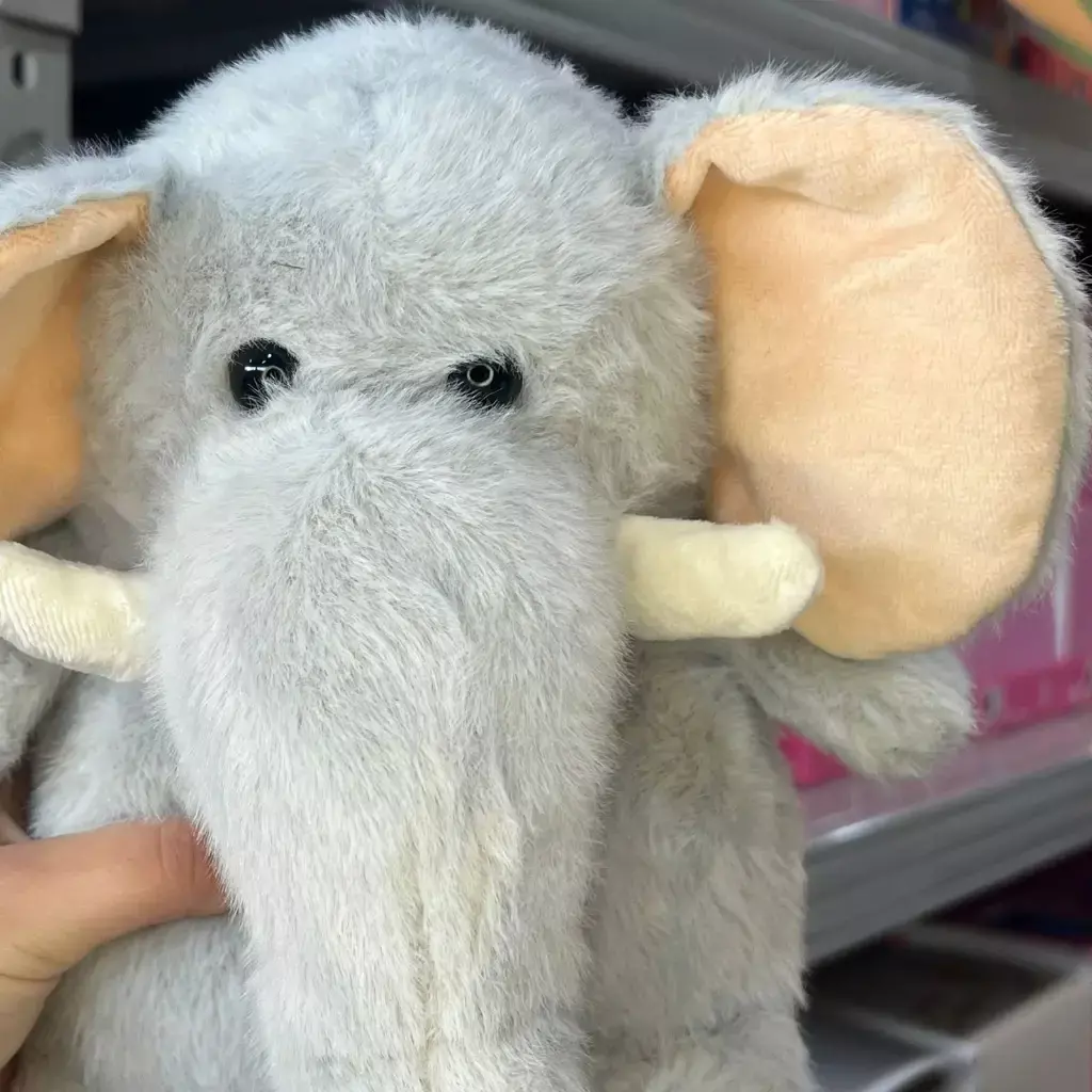 Peluche suave y adorable con forma de elefante gris. Diseno kawaii con orejas grandes, colmillos blancos y detalles bordados que lo hacen unico. Esponjoso y de excelente calidad, perfecto para regalar, decorar o sumar a tu coleccion de peluches de animalitos.