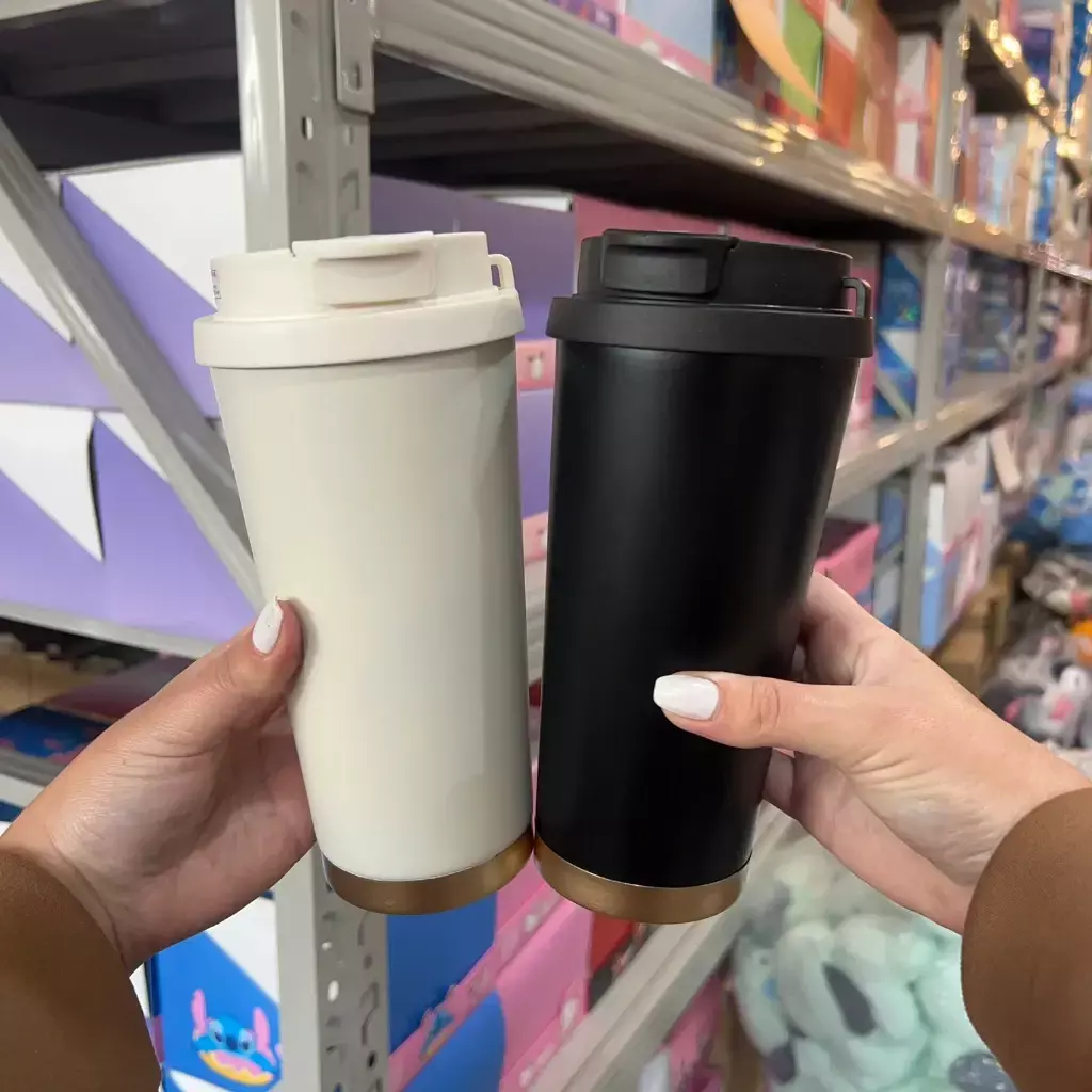 Vaso termico de acero inoxidable con tapa hermetica y pico abatible para beber facilmente. Mantiene la temperatura de tus bebidas calientes o frias por mas tiempo. Disponible en color negro o blanco con base metalizada. Ideal para llevar al trabajo, la facultad o en viajes.