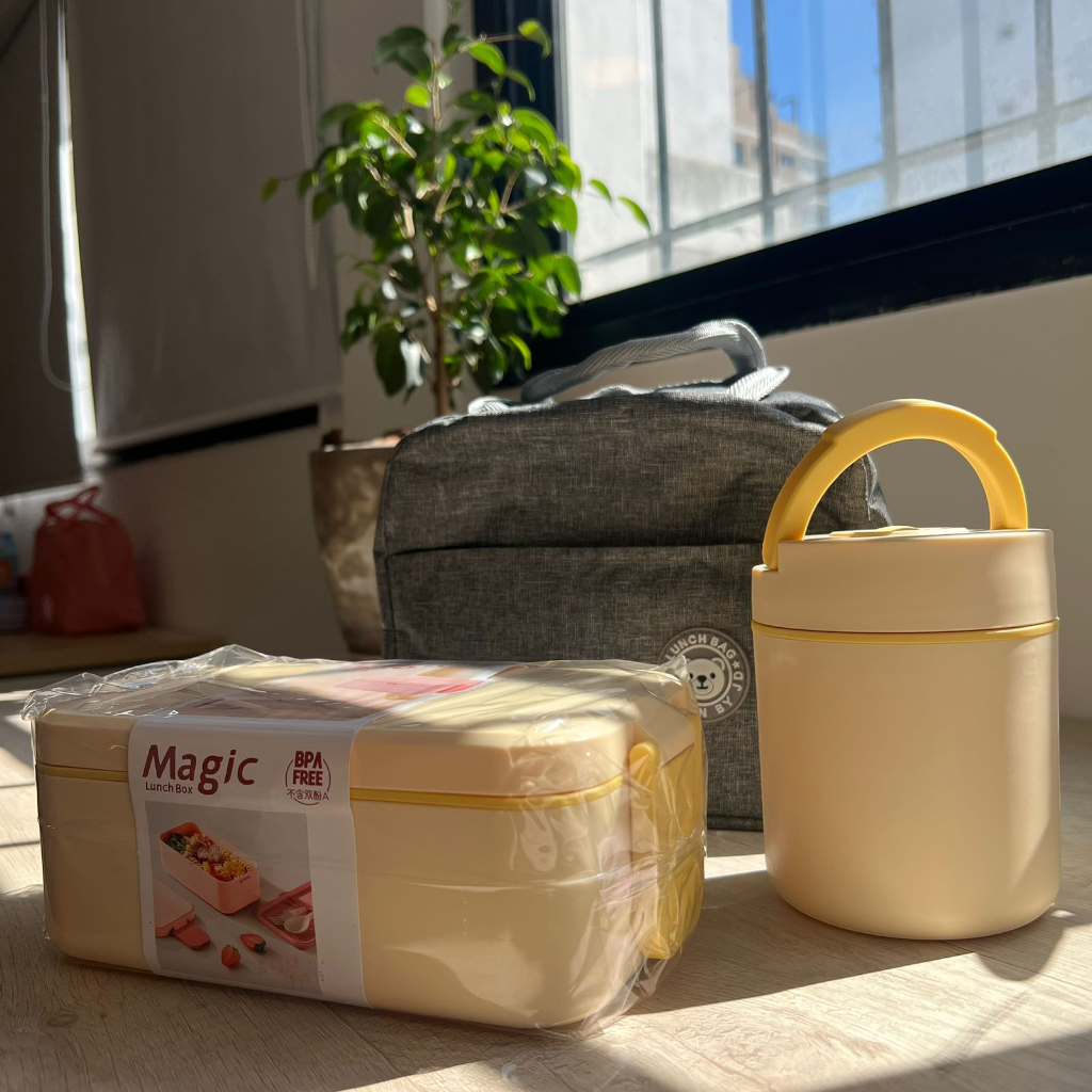 Set práctico compuesto por un bolso térmico con diseño de osito y dos luncheras de plástico resistente. Incluye una vianda rectangular con cierre hermético y cubiertos, y un termo contenedor cilíndrico con tapa a rosca. El bolso cuenta con asa reforzada y aislante interior que mantiene la temperatura de los alimentos. Disponible en colores rosa, azul y gris. Ideal para la oficina, el colegio o viajes.