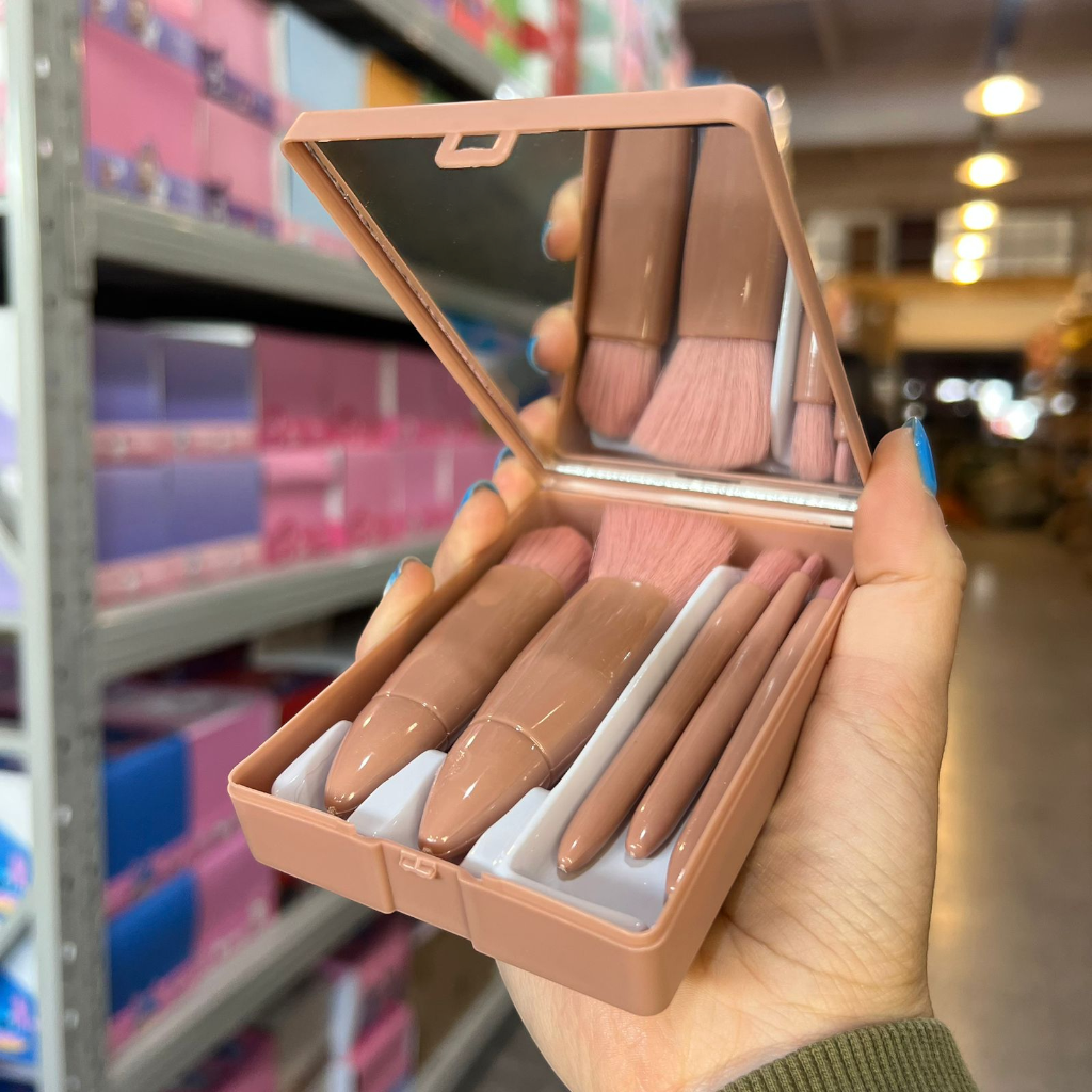 Set de brochas de maquillaje en estuche compacto con espejo incluido. Contiene varias brochas de distintos tamaños para aplicar base, polvos, rubor y sombras, logrando un acabado uniforme en cualquier lugar. Su diseño portátil y elegante lo hace perfecto para viajes, la cartera o retoques diarios.