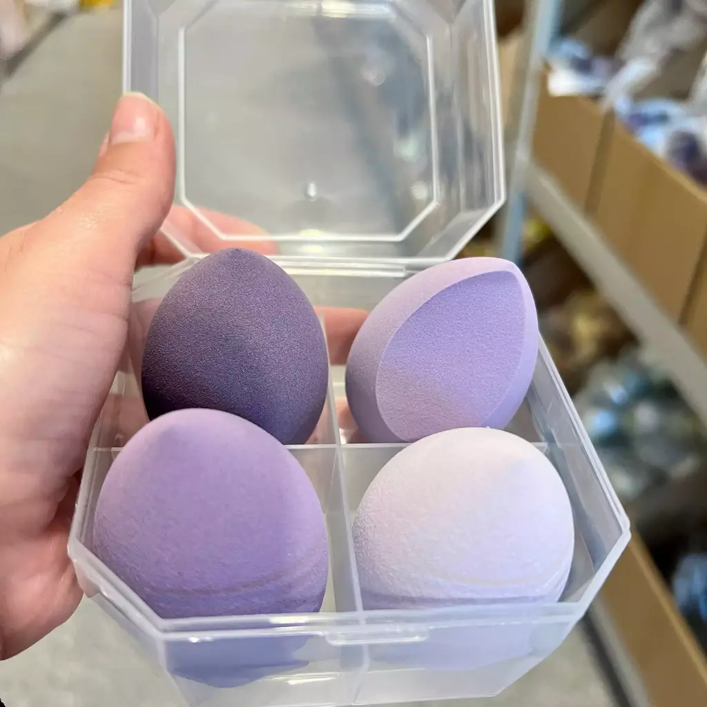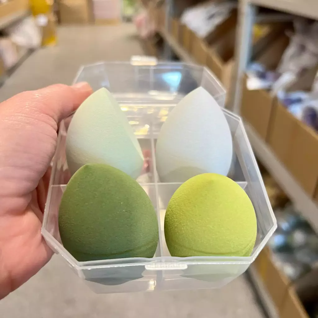 Set de esponjas de maquillaje en caja rígida. Incluye 4 esponjas de diferentes formas y colores, ideales para aplicar base, corrector o polvos. Su textura suave permite un acabado uniforme y natural.