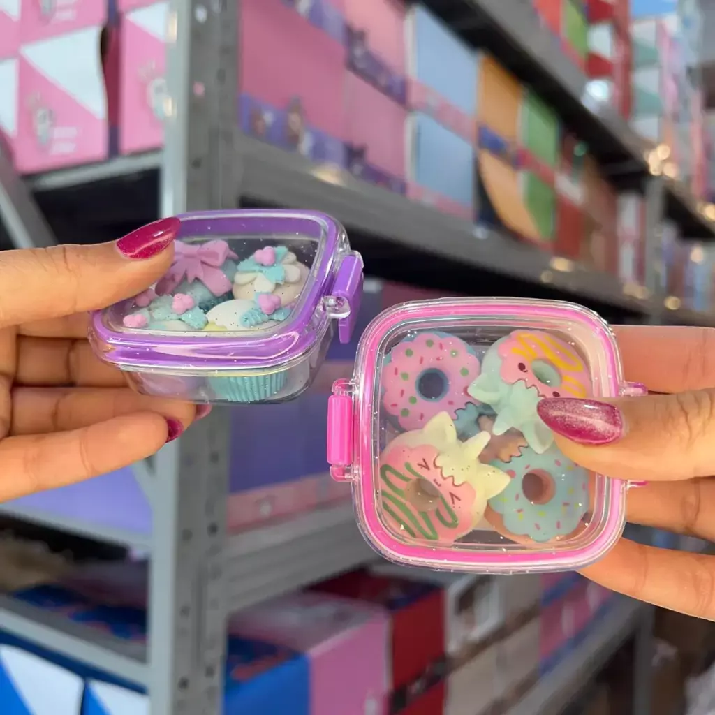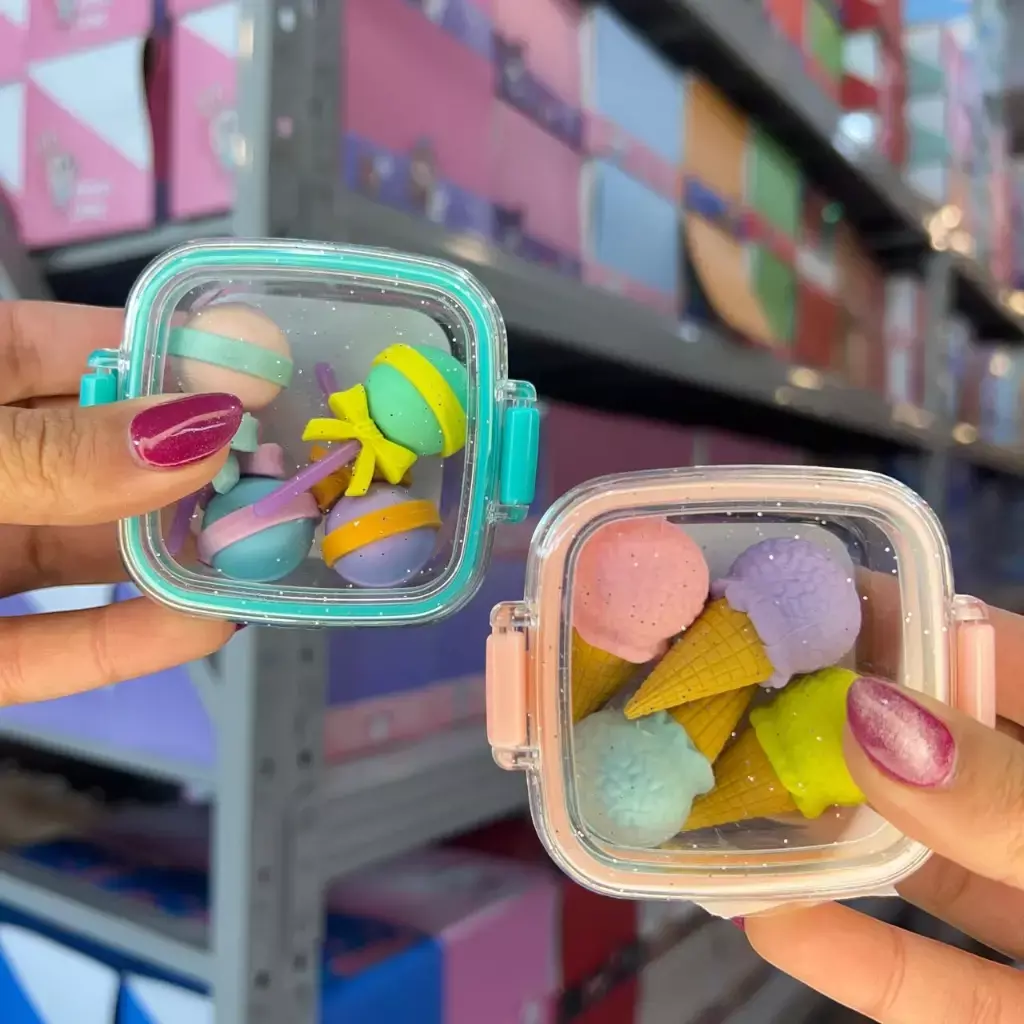 Set de gomas de borrar con diseño de helados de colores en miniatura. Vienen en una práctica cajita plástica transparente, ideales para organizar y coleccionar. Cada cajita incluye varios diseños divertidos, perfectos para uso escolar, decoración de escritorio o regalo original.