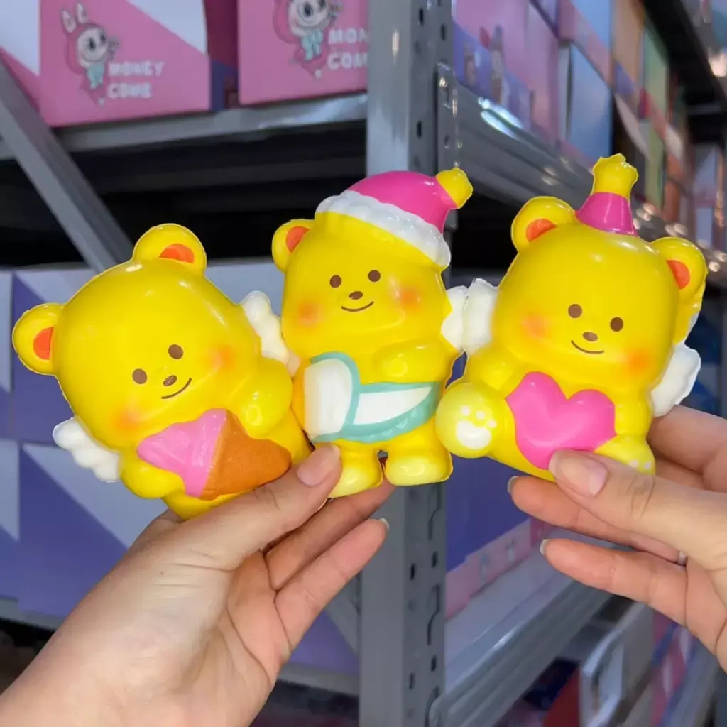 Squishy en forma de oso amarillo con alas, disponible en diferentes diseños divertidos: con helado, con gorro navideño o con corona. Su textura es suave y esponjosa tipo slow rising, ideal para aliviar el estres, decorar o coleccionar. Colores brillantes y acabado detallado que lo hacen atractivo para todas las edades.