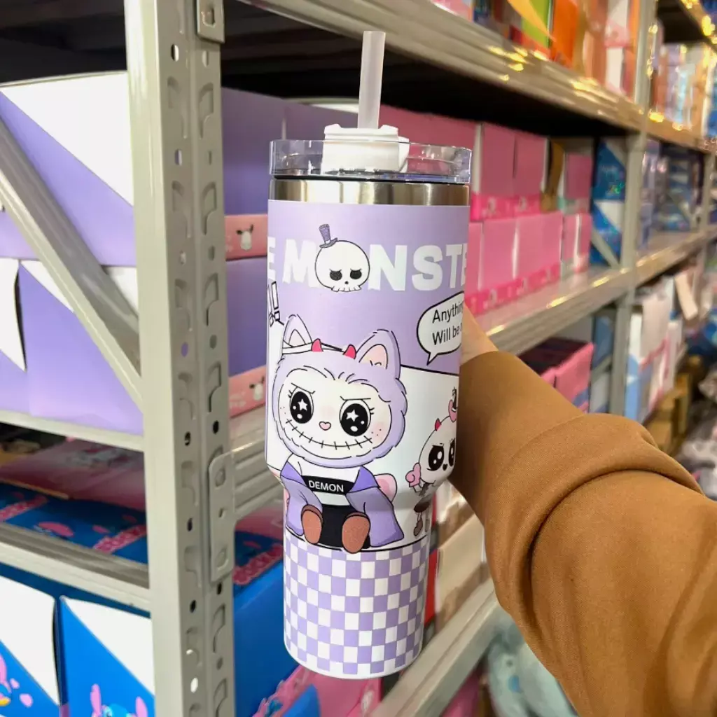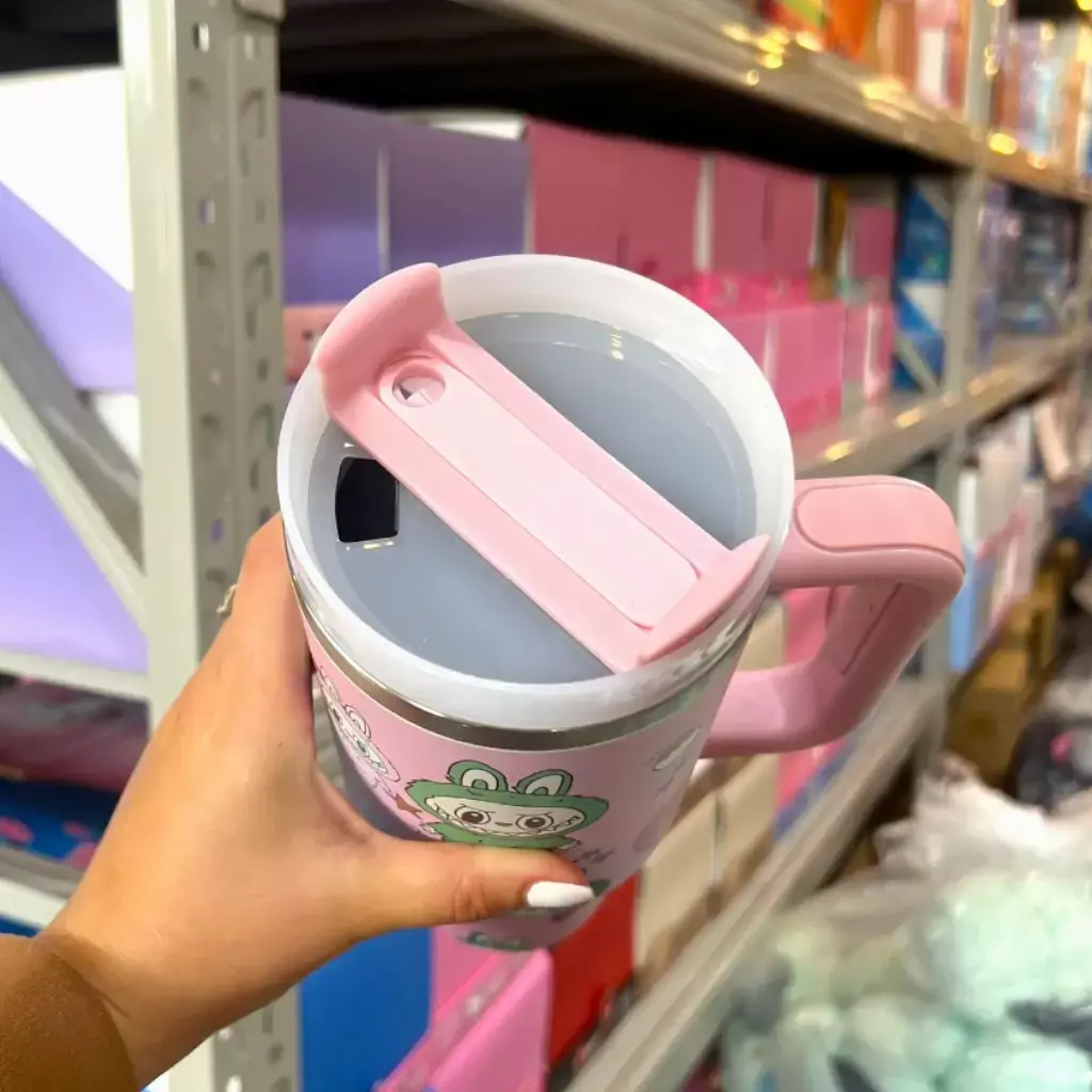 Vaso termico de gran capacidad con manija lateral y tapa hermetica. Incluye sorbete reutilizable y esta decorado con ilustraciones kawaii de Labubu y The Monsters. Fabricado en acero inoxidable, mantiene las bebidas frias o calientes por mas tiempo. Disponible en modelos estampados rosa o azul, ideal para coleccionistas y amantes del estilo kawaii.
